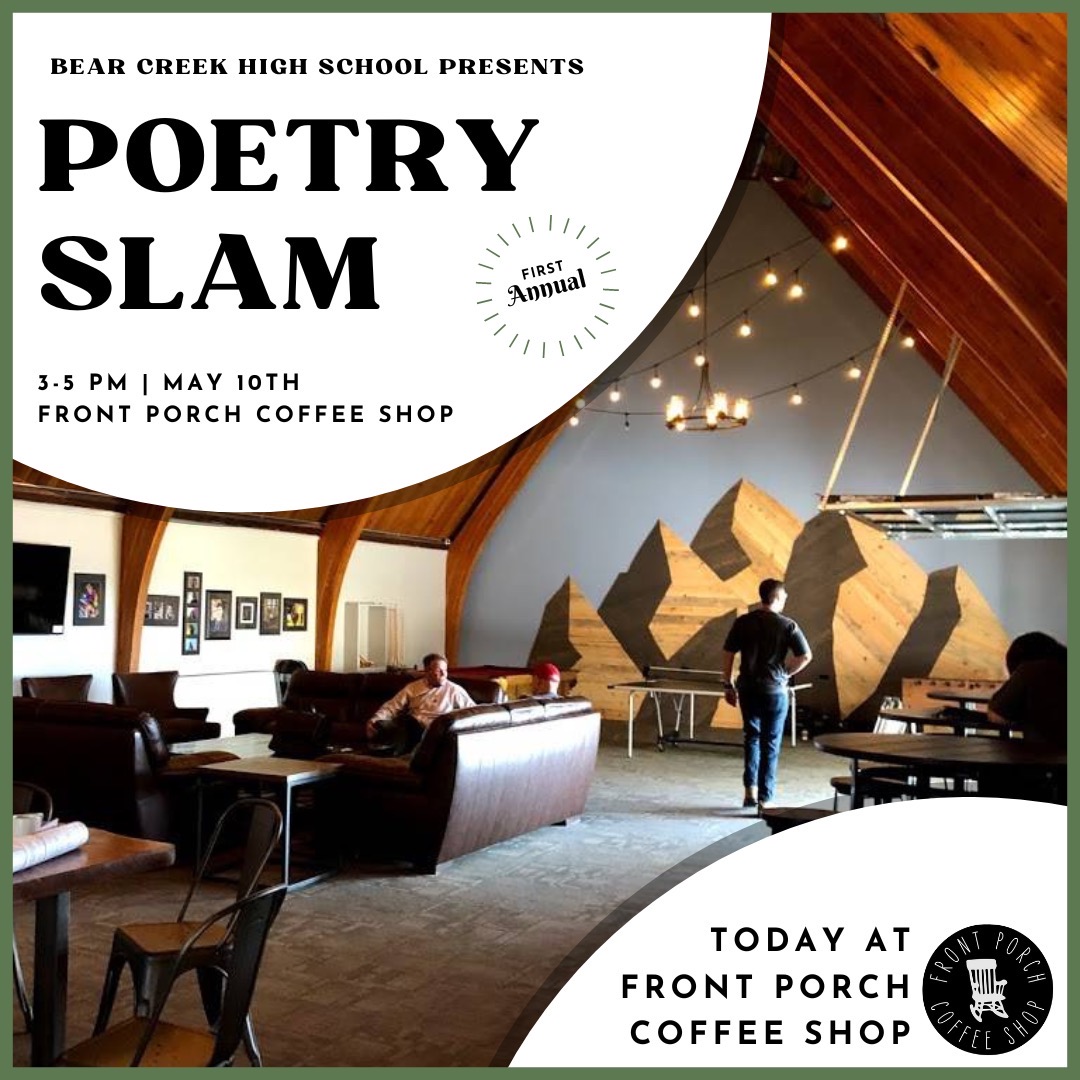Poetry is best experienced in a community. That is why Bear Creek High School‘s NEHS chapter, BCHS Literati, hosted our first annual poetry slam this spring. In partnership with our friends at Front Porch Coffee Shop and Bear Creek’s very own BC Poetry Club, we were able to curate an evening committed to the celebration and tradition of spoken-word poetry.
