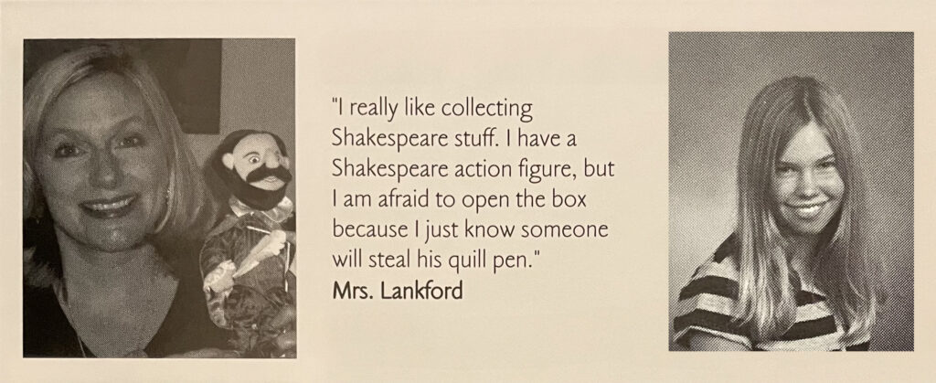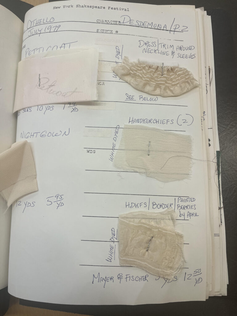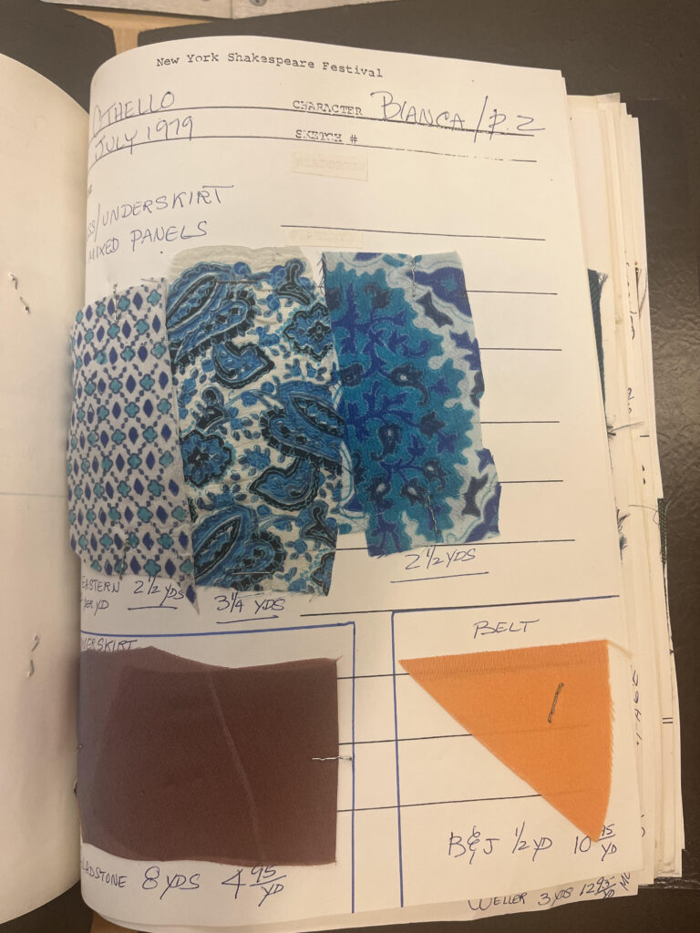 Although our English 2 course is an interdisciplinary one in which we often consider visual art, music, and culture in connection to the literary texts we read, we’ve rarely discussed the role of fashion and costuming. During our trip to the archives, we were intrigued by the costume sketches and the extensive collection of fabric swatches from the 1979 production and how they compared to past and current presentations of characters. We now intend to incorporate discussions of costuming and will encourage students to think about how elements like fabric patterns, color, and tailoring shape perceptions of Othello and Desdemona in particular.