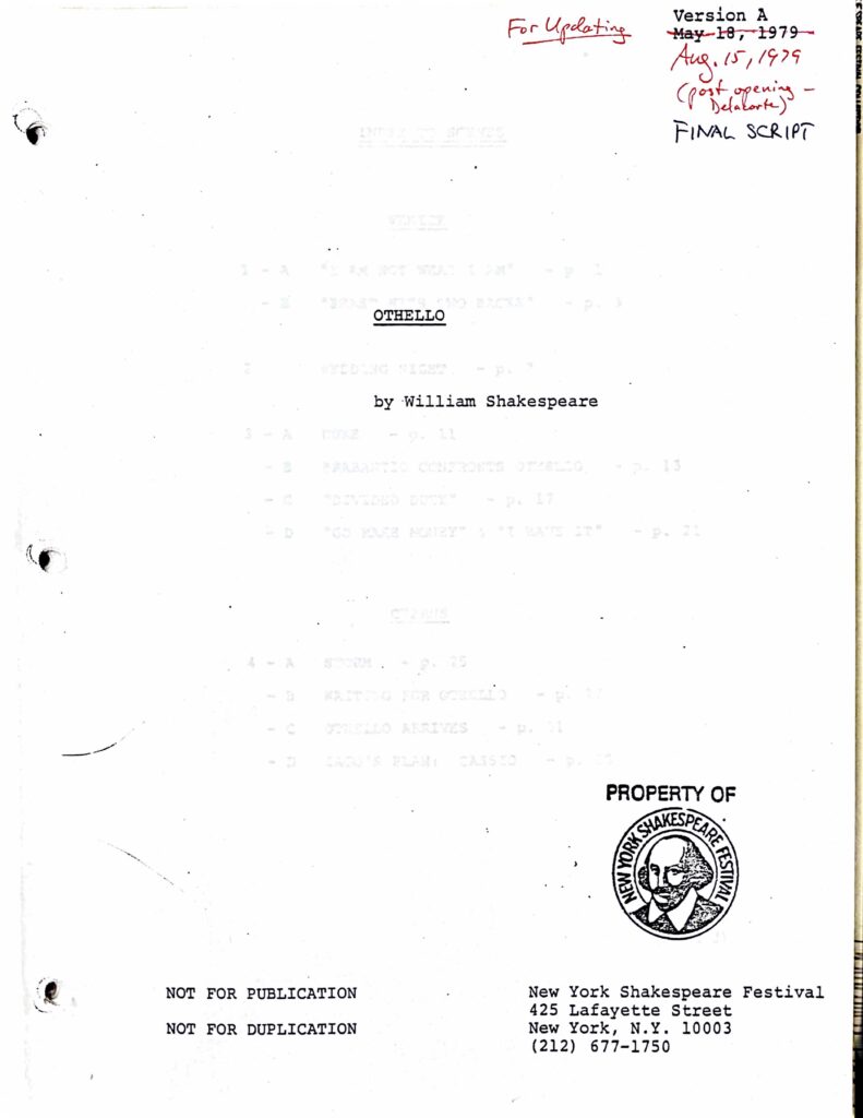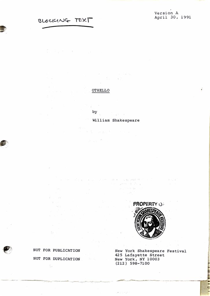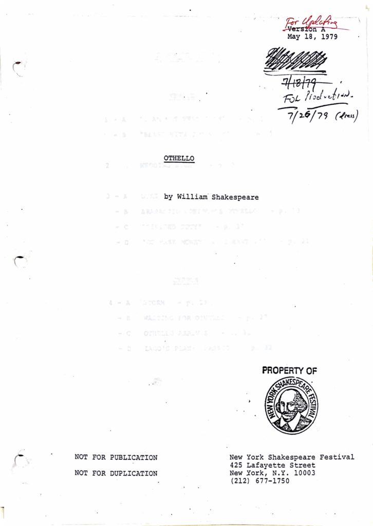 We began our trip with a visit to the special collections archives at the New York Library for the Performing Arts, where we reviewed boxes of materials from the New York Shakespeare Festival, the organization that produces the city’s iconic Shakespeare in the Park productions. The majority of materials came from the 1979 production starring Raúl Julia as Othello, Richard Dreyfuss as Iago, and Frances Conroy as Desdemona, but also contained materials from several mid-century productions and the 1991 production in which Julia reprised the titular role alongside Christopher Walken as Iago.