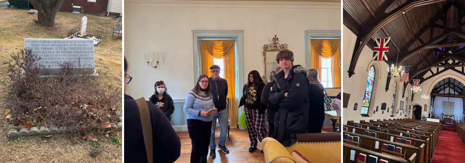 Our NEHS students were able to live the experience of the graphic novel Here, from a real-life perspective. After reading the novel, the students took a tour of the Proprietary House, once home to William Franklin, a New Jersey governor and Loyalist, and illegitimate son of Founding Father Benjamin Franklin. They learned about the history of the area, which is reflective of the events in the graphic novel and even got to take a picture in front of the house that the book is set in. Students then toured St. Peter’s cemetery and church, where many of the prominent historic families of the area are buried. There were tombstones dating back to the 1700s and students were even able to see the grave of Thomas Mundy Peterson (1826-1904), the first African American to vote in any election. Many of the students were able to compare the graveyard in the books they had been reading in class to the one that they were touring, noting the bare, unhallowed ground where supposed witches were buried.